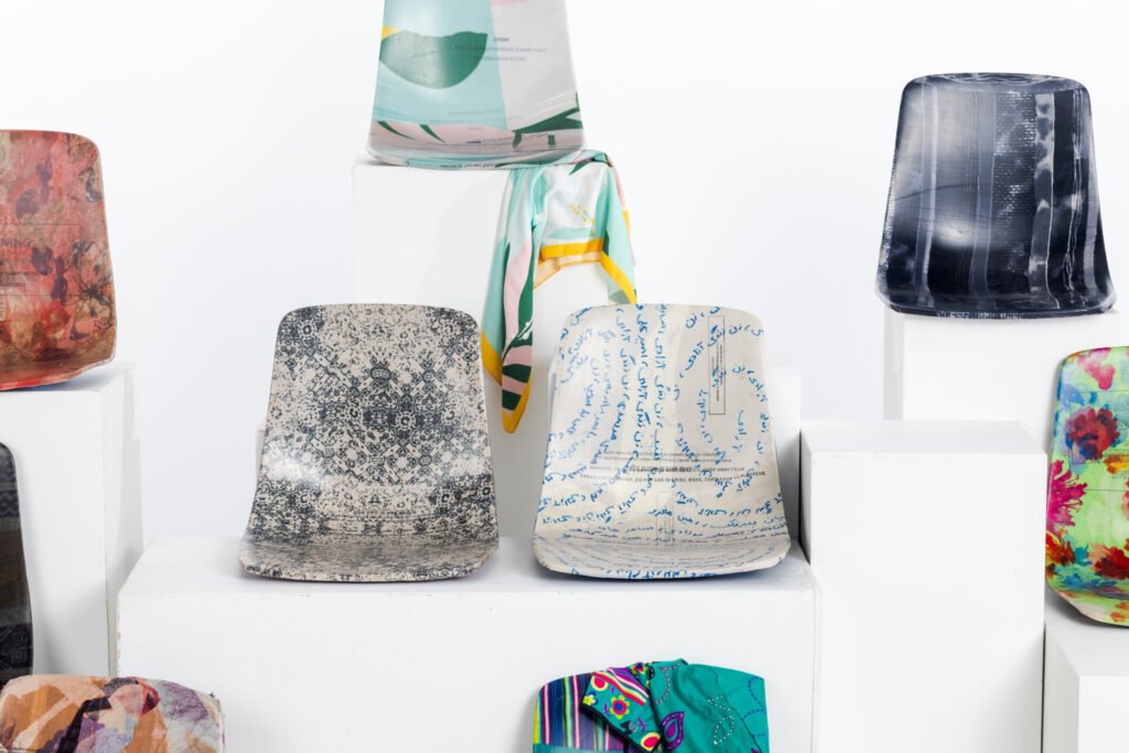 The project’s creativity lies in its approach to storytelling through a tangible and functional product enabled by circular material innovation. The seats are made from unique composite material developed in collaboration with an Australian manufacturer specialising in composite technologies. Using a combination of lamination and pressure molding, the result material is a durable and lightweight composite made from 100% waste resources such as unwanted and donated head scarfs and waste plastic bags.